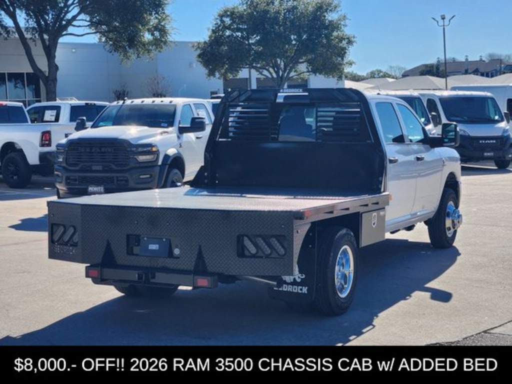 Bright White Clearcoat 2026 Ram 3500 Tradesman CHASSIS 4WD 8-Speed Automatic Cummins 6.7L I6 Turbodiesel Bluetooth, Backup Camera, 11.50" Dual Wheels Rear Axle, 4-Wheel Disc Brakes, 40/20/40 Split Bench Seat, 4G LTE Wi-Fi Hot Spot, 6 Speakers, 6000# Front Axle with Hub Extension, ABS brakes, Air Conditioning, AM/FM radio: SiriusXM, Apple CarPlay, Apple CarPlay/Android Auto, Black Exterior Mirrors, Black Power Heated Fold Telescope Mirrors, Black Wheel Center Hub, Bright Front Bumper, Bright Wheel Skins, Center Hub, Chrome Appearance Group A, Chrome Grille Surround, Compass, Connectivity - US/Canada, Delay-off headlights, Dual front impact airbags, Dual Rear Wheels, Electronic Stability Control, Exterior Mirrors Courtesy Lamps, Exterior Mirrors with Heating Element, Exterior Mirrors with Supplemental Signals, For Details, Visit DriveUconnect.com, Front anti-roll bar, Front Armrest with Cupholders, Front Center Armrest w/Storage, Front fog lights, Front License Plate Bracket, Front reading lights, Fully automatic headlights, Google Android Auto, GPS Antenna Input, HD Vinyl 40/20/40 Split Bench Seat, Illuminated entry, Integrated Voice Command with Bluetooth, Manual Adjust 4-Way Driver Seat, Manual Adjust 4-Way Front Passenger Seat, Manual Folding Exterior Mirrors, Matte Black Mesh Grille with Chrome, Mirror Running Lights, Nexen Brand Tires, Occupant sensing airbag, Outside temperature display, Overhead console, Panic alarm, ParkView Rear Back-Up Camera, Passenger door bin, Passenger vanity mirror, Power Adjust Mirrors, Power steering, Power windows, Power-Adjustable Convex Aux Mirrors, Quick Order Package 25A Tradesman, Radio data system, Radio: Uconnect 5 with 8.4" Display, Rear anti-roll bar, Rear Folding Seat, Rear Window Defroster, Remote keyless entry, Remote USB Port - Charge Only, Speed control, Storage Tray, Tachometer, Temperature and Compass Gauge, Tilt steering wheel, Traction control, Tradesman Level 1 Equipment Group, Trailer Brake Control, Trailer Light Check, Variably intermittent wipers, Voltmeter, Wheels: 17" x 6.0" Steel Chrome Clad, Wheels: 18" x 8.0" Polished Aluminum, Wheels: 18" x 8.0" Steel Painted. Prices do not include tax, title and license fees.$2500 - 2026 National Bonus Cash . Exp. 03/31/2026 Price includes dealer added accessories.