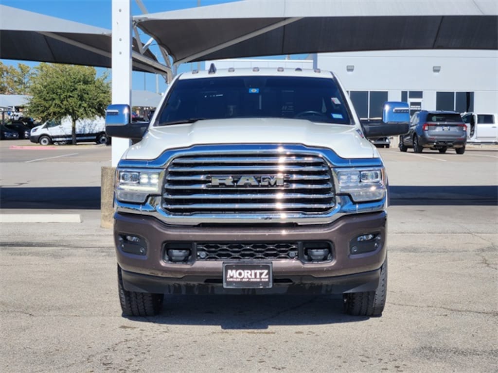 Pearl White 2023 Ram 2500 Longhorn 4WD 6-Speed Automatic Cummins 6.7L I6 Turbodiesel Bluetooth, Backup Camera, The Moritz Promise LIMITED LIFETIME POWERTRAIN PROTECTION PLAN See dealer for details, 12" Touchscreen Display, 17 Speaker harman/kardon Premium Sound, 4G LTE Wi-Fi Hot Spot, Alexa Built-In, Anti-Spin Differential Rear Axle, Apple CarPlay, Apple CarPlay/Android Auto, Auto-dimming Rear-View mirror, Automatic temperature control, Blind Spot & Cross Path Detection, Brake assist, Connected Travel & Traffic Services, Connectivity - US/Canada, CTR Stop Lamp w/Cargo View Camera, Disassociated Touchscreen Display, Electronic Stability Control, For Details, Visit DriveUconnect.com, For More Info, Call 800-643-2112, Front anti-roll bar, Front Bucket Seats, Front Performance Tuned Shock Absorbers, Full Length Premium Upgraded Floor Console, Fully automatic headlights, Garage door transmitter, Genuine wood console insert, Genuine wood dashboard insert, Genuine wood door panel insert, Global Telematics Box Module (TBM), Google Android Auto, GPS Antenna Input, GPS Navigation, HD Radio, Heated Front Seats, Heated Second Row Seats, Hill Descent Control, Illuminated entry, Integrated Voice Command w/Bluetooth, LED Bed Lighting, Longhorn Level 1 Equipment Group, MOPAR Spray In Bedliner, Navigation System, Off Road Package, Off-Road Information Pages, ParkView Rear Back-Up Camera, Power Deployable Running Boards, Quick Order Package 2HK Longhorn, Radio: Uconnect 5 Nav w/12.0" Display, Ramcharger Wireless Charging Pad, Rear anti-roll bar, Rear Performance Tuned Shock Absorbers, Remote keyless entry, Security system, Selectable Tire Fill Alert, SiriusXM Radio Service, SiriusXM w/360L, Steering wheel mounted audio controls, Surround View Camera System, Towing Technology Group, Trailer Reverse Guidance, Trailer Tow Pages, Ventilated Front Seats.
