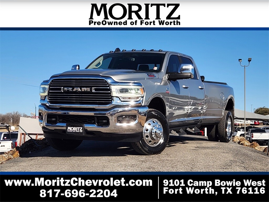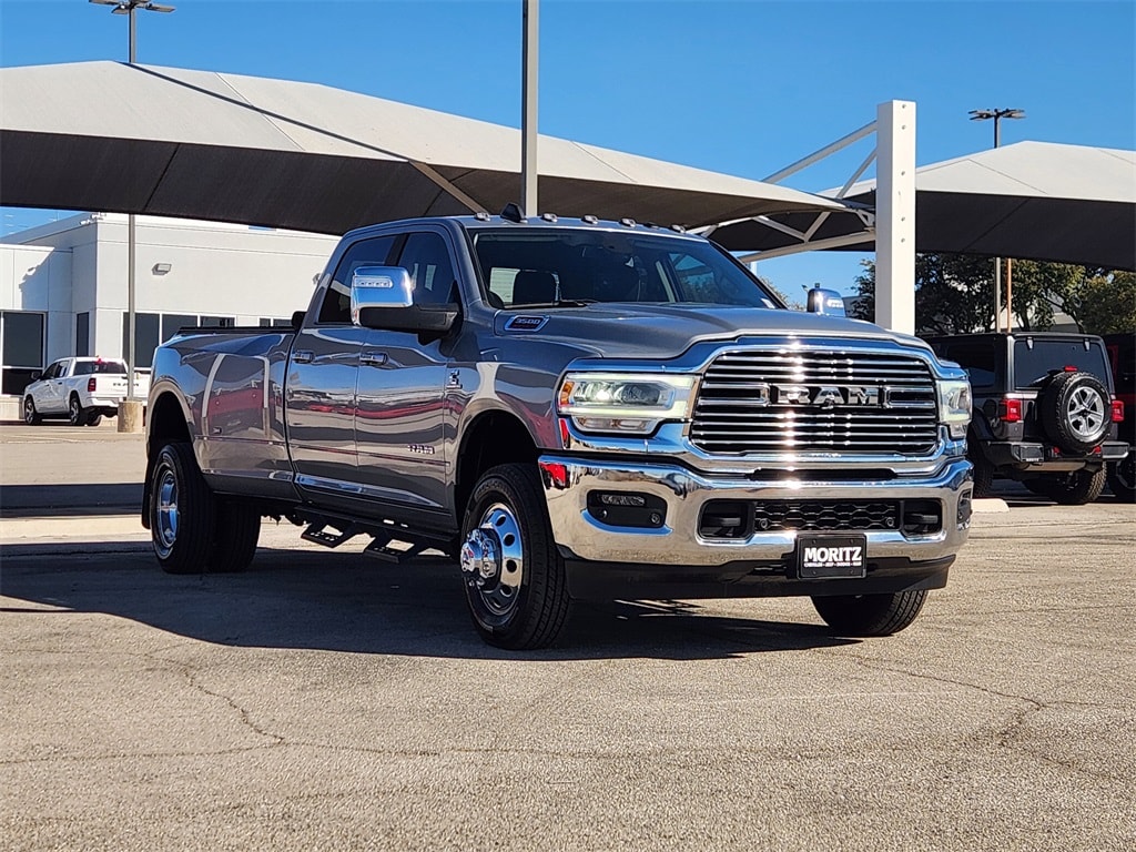 Certified. Billet Silver Metallic Clearcoat 2024 Ram 3500 Laramie 4WD 6-Speed Automatic Cummins 6.7L I6 Turbodiesel Bluetooth, Backup Camera, The Moritz Promise LIMITED LIFETIME POWERTRAIN PROTECTION PLAN See dealer for details, 115V Auxiliary Rear Power Outlet, 12" Touchscreen Display, 18" x 8" Polished Aluminum Wheels, 2 Way Rear Headrest Seat, 2nd Row In Floor Storage Bins, 4 Way Front Headrests, 4G LTE Wi-Fi Hot Spot, 50 Gallon Fuel Tank, 5th Wheel/Gooseneck Towing Prep Group, 8.4" Touchscreen Display, Alexa Built-In, All R1 High Radios, All Radio Equipped Vehicles, Apple CarPlay, Apple CarPlay/Android Auto, Auto Adjust In Reverse Exterior Mirrors, Auto Dimming Exterior Passenger Mirror, Auto High Beam Headlamp Control, Auto Power-Folding Mirrors, Auto-Dimming Exterior Mirrors, Auto-dimming Rear-View mirror, Automatic temperature control, Blind Spot & Cross Path Detection, Box & Rear Fender Clearance Lamps, Bright Front Bumper, Bright Rear Bumper, Bucket Seats, Center Hub, Chrome Bumper Package, Chrome Exterior Mirrors, Connected Travel & Traffic Services, Connectivity - US/Canada, CTR Stop Lamp w/Cargo View Camera, Disassociated Touchscreen Display, Electronic Stability Control, Electronically Controlled Throttle, Exterior Mirrors Courtesy Lamps, Exterior Mirrors w/Heating Element, Exterior Mirrors w/Memory, Exterior Mirrors w/Supplemental Signals, Foam Bottle Insert (Door Trim Panel), Folding Flat Load Floor Storage, For Details Visit DriveUconnect.com, For More Info, Call 800-643-2112, Forward & Reverse Utility Lights, Front anti-roll bar, Front LED Fog Lamps, Front Seat Back Map Pockets, Full Length Upgraded Floor Console, Garage door transmitter, Global Telematics Box Module (TBM), Google Android Auto, GPS Antenna Input, GPS Navigation, HD Radio, Heated Front Seats, Heated Steering Wheel, High Back Seats, Illuminated entry, Integrated Center Stack Radio, Integrated Voice Command w/Bluetooth, Laramie Level 1 Equipment Group, Leather Trimmed Bucket Seats, LED Reflector Headlamps, LED Tail Lamps, Mirror Running Lights, Navigation System, Off-Road Information Pages, ParkSense Front/Rear Park Assist System, ParkView Rear Back-Up Camera, Power 2-Way Driver Lumbar Adjust, Power 2-Way Passenger Lumbar Adjust, Power 8-Way Adjustable Passenger Seat, Power Adjust 8-Way Driver Seat, Power Adjust Mirrors, Power Adjustable Pedals w/Memory, Power Heat Fold Memory Telescopic Mirrors, Power Telescoping Mirrors, Power-Adjustable Convex Aux Mirrors, Radio: Uconnect 5 Nav w/12.0" Display, Radio: Uconnect 5 Nav w/8.4" Display, Rain Sensitive Windshield Wipers, Rear 60/40 Folding Seat, Rear Power Sliding Window, Rear step bumper, Rear Window Defroster, Remote Tailgate Release, Security system, Selectable Tire Fill Alert, SiriusXM Radio Service, SiriusXM w/360L, Steering wheel mounted audio controls, Surround View Camera System, Towing Technology Group, Traction control, Trailer Reverse Guidance, Trailer Tow Pages.